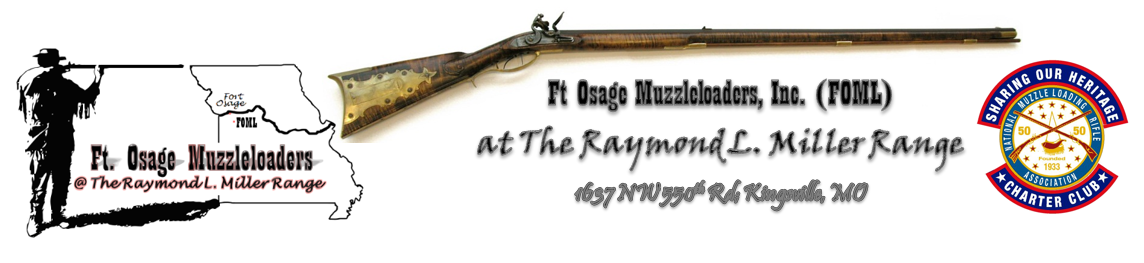 have access the range the rest of the time. Membership is not required to participate in any of the club events. However, membership is required to access the range any other time. Membership Application, Club and Range Rules. NMLRA Rules. FOML has monthly paper matches on the second Sunday of each month for rifle (offhand and bench), pistol & revolver. We have a 25-, 50- & 100-yard covered paper range and our primitive steel range is across the creek in the woods. During the winter months of December & January, we shoot steel targets. There is a novelty shoot and trade fair the fourth Saturday from March thru October. We shoot on New Year's Day, eat chili and try to stay warm. We have been hosting the Missouri NMLRA Territorial Championships (excluding Shotgun) the weekend of the second Sunday. Please note: Check our calendar or schedule for the date. During the month of June, we host the Missouri State Black-Powder Rifle and Pistol Shoot. For several years now, we have had a special three-day, bench-only shoot in the summer and recently added regular table shoot matches. In October, the club has an Indian Summer Shoot which is the third of our three-day shoots. FOML is also affiliated with the Missouri Offhand Association – A statewide, year-long, record keeping organization that records and ranks shooters in different classification categories. The continued improvements at the range include reconstructing our berms after suffering great damage in March 2013 along with our covered firing line structure & loading benches from heavy snow and wind. Thanks to the hard work of volunteers over several weekends of cleaning up the damage, insurance, a loan and a local contractor, we were able to rebuild better than before in time for the NMLRA Territorial Championships in May. Our new and improved facility should last for many years as a place for friends and family to gather and promote early American history. The club hosts many events throughout the year. Check the events page for more information. On the News page you will find copies of the club’s newsletters and photos of past events. Ft. Osage Muzzleloaders Inc., is a non-profit corporation organized under the “General Not for Profit Corporation Act of the State of Missouri” for the purpose of promoting the history and shooting of black powder, muzzle loading firearms. The following non-exclusive list of objectives will guide the corporation’s efforts to achieve this goal. 1. Teaching the fundamentals of firearm safety to all members, their families and their guests. 2. Preserving that part of our early American heritage, which was based on honesty, loyalty, good sportsmanship and good fellowship. 3. Educating the general public on the history related to the time period represented by the use of black powder firearms. 4. Creating and spreading enthusiasm regarding the type of firearms, specifically flintlock and percussion lock, with which our forefathers fought for and built this nation. 5. Promoting the safe and effective use of said firearms in the fields of target shooting and hunting. Club History Back in the early 1960’s, a small group of friends started a black powder muzzle loading club. One of the main founding members was Ray Miller. He moved his family to Kingsville, MO, upon buying the land that is now the club’s range. A lot of hard work went in to putting together the club and range. In October 1963, the club hosted its first Indian Summer Shoot. In July of 1964, Ft. Osage Muzzle Loaders, Inc. was registered with the state of Missouri. In October 2014, the club celebrated a milestone by hosting its 50th Annual Indian Summer three-day shoot. In the golden age of Ft Osage Muzzleloaders, during the 1970's & 1980's, it was not uncommon to see 100 shooters on the line and more waiting for a position on the line to open. Our numbers are down, like many muzzle loading clubs; however, like many clubs we have a great group of folks who make up our shooting 'family.' Several of our club members have participated and are currently active participants nationally at Friendship, IN, and The Western National Shoot in Phoenix, AZ. We currently have over 100 members. Sadly, in October 2012, we lost one of our valued founding members, Raymond L. Miller. After his passing, the club voted to name the range in remembrance and in honor of him. Many of the club members we have lost over the years are honored on the Last Relay page.